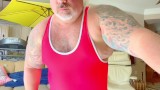 fat man has a huge cream pie in his wrestling gear and shows his fat dirty ass and cums hands free