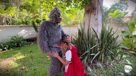 Little Red Riding Hood lost a fruit from her basket and is looking for it in the wolf's pants.